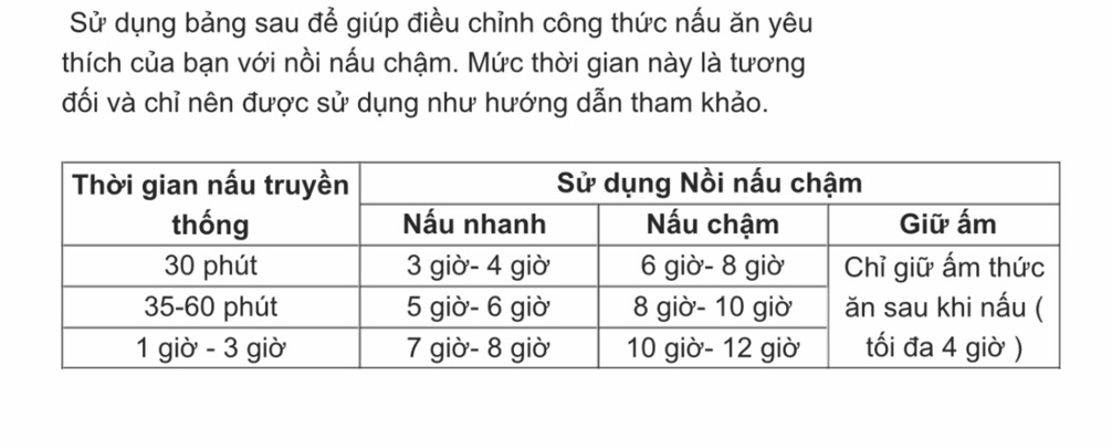 -Sử dụng theo bảng trên (xem ảnh 4) để giúp điều chỉnh công thức nấu ăn yêu thích của bạn với nồi nấu chậm. Mức thời gian này là tương đối và chỉ nên được sử dụng như hướng dẫn tham khảo.