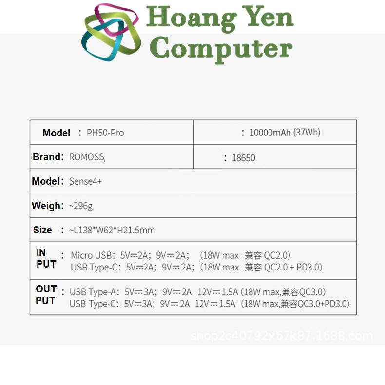 Giới thiệu [MẪU MỚI] Sạc Dự Phòng Romoss Sense 4+ 10000Mah (Sạc Nhanh QC3.0 18W, PD 18W) - BH 1 Năm - Hoàng Yến Computer