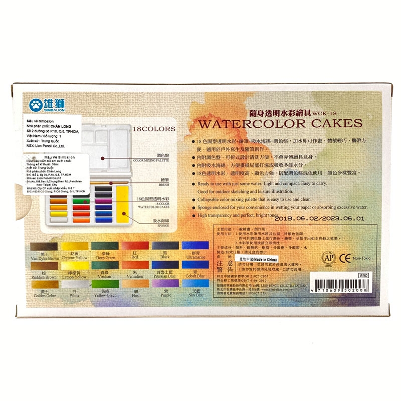 Bộ Màu Nén Simbalion 18 Màu WCK-18 chuyên dùng để vẽ, phác họa cho sinh viên mỹ thuật, họa sĩ và những người yêu thích hội họa. Bộ sản phẩm gồm cọ vẽ, bọt biển, 18 bánh màu, khay màu vẽ và hộp nhựa, hỗ trợ tối đa cho quá trình sáng tạo của bạn. Thiết kế gọn nhẹ, thuận tiện mang theo bên người khi đi ra ngoài để sử dụng bất kỳ lúc nào. Màu vẽ sử dụng thành phần nguyên liệu chất lượng cao, cho màu sắc đúng tiêu chuẩn của ngành mỹ thuật. Màu vẽ có khả năng chồng màu và pha trộn màu hiệu quả theo ý muốn. Màu sắc tươi đẹp, độ phủ màu cao, mịn và hòa tan tốt trong nước giúp bạn có thể tự do sáng tạo tùy theo ý thích. Đặc biệt, màu không vón cục, không có mùi khó chịu và có thể tẩy rửa được, đem lại sự tiện lợi hơn cho người sử dụng. Sản phẩm đã được kiểm định và chứng nhận an toàn, hợp vệ sinh, không chứa tạp chất hoặc sản sinh chất độc hại khi sử dụng nên rất an toàn với sức khỏe của người sử dụng.