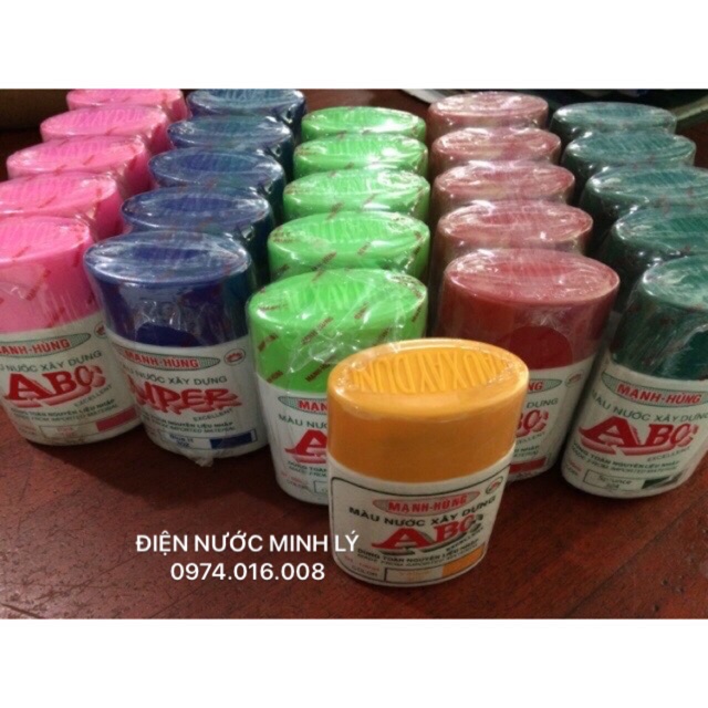 Màu nước xây dựng đủ màu :màu đỏ ,vàng ,đen ,xanh ngọc ,xanh biển ,xanh bộ đội ,hồng ,nâu ....Màu nước dùng để pha với vôi nước quét tường.