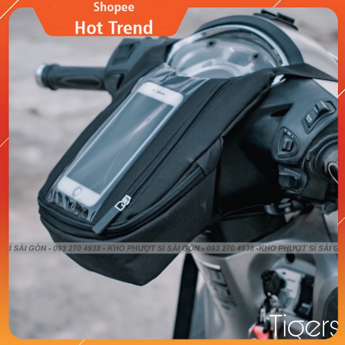 Mẫu túi treo đầu xe máy đứng màu đen cảm ứng điện thoại - Túi treo đầu xe ngang đựng dt chạy Grab ShipperKhi di chuyển ngoài đường thì trang bị túi treo đầu xe giúp bạn thao tác dễ dàng nhờ mặt túi cảm ứng điện thoại được và treo được hấu hết các dòng xe máy hiện nay từ xe số, xe tay ga, chỉ trừ vài dòng xe ghidong trần như motor thì không treo được