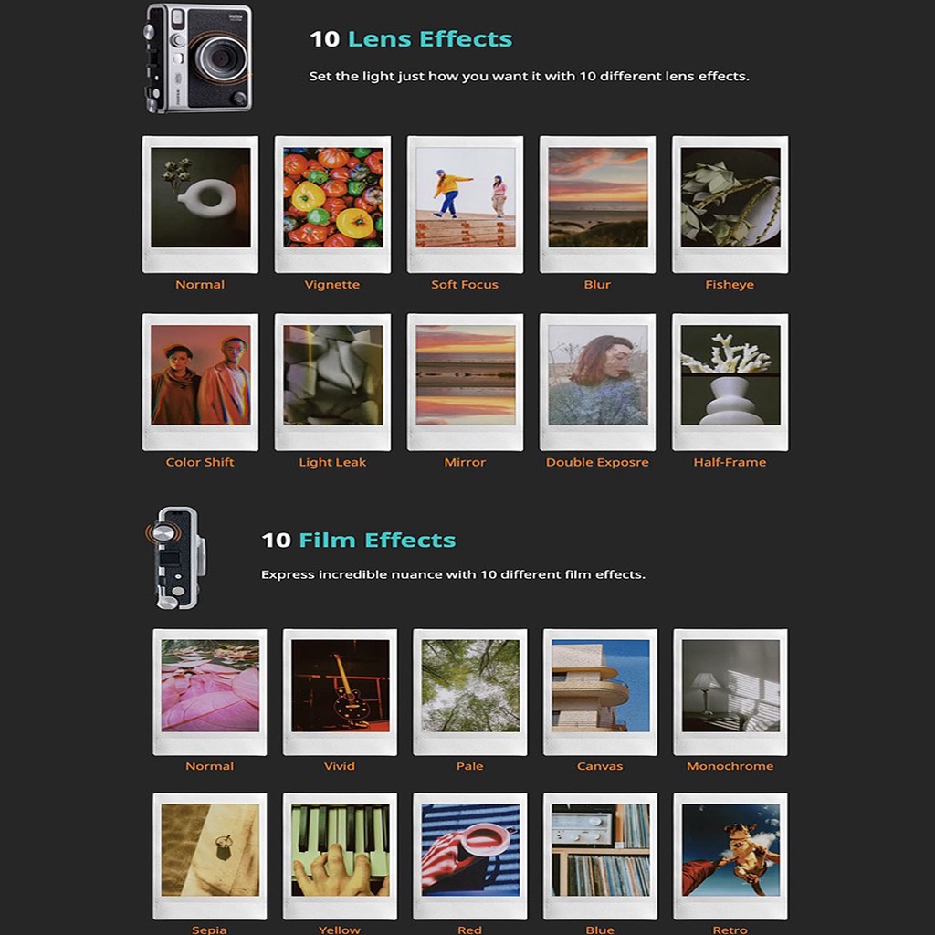 - Fujifilm Instax Mini Evo Hybrid bao gồm 10 ống kính tích hợp và 10 hiệu ứng phim, cho người dùng đến hàng trăm kết hợp có thể lựa chọn. Bạn có thể tạo các bản in trực tiếp từ máy ảnh hoặc in ảnh gửi từ điện thoại thông minh được kết nối bằng ứng dụng Instax Mini EVO.