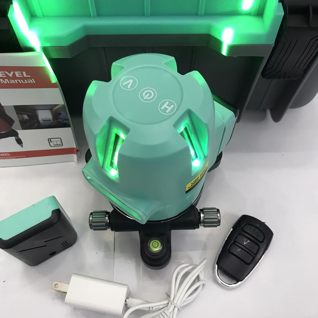 + Đầu ra tia laser màu xanh 1 tia ngang, 4 tia dọc vuông góc nhau, 1 chấm laser dọi xuống.