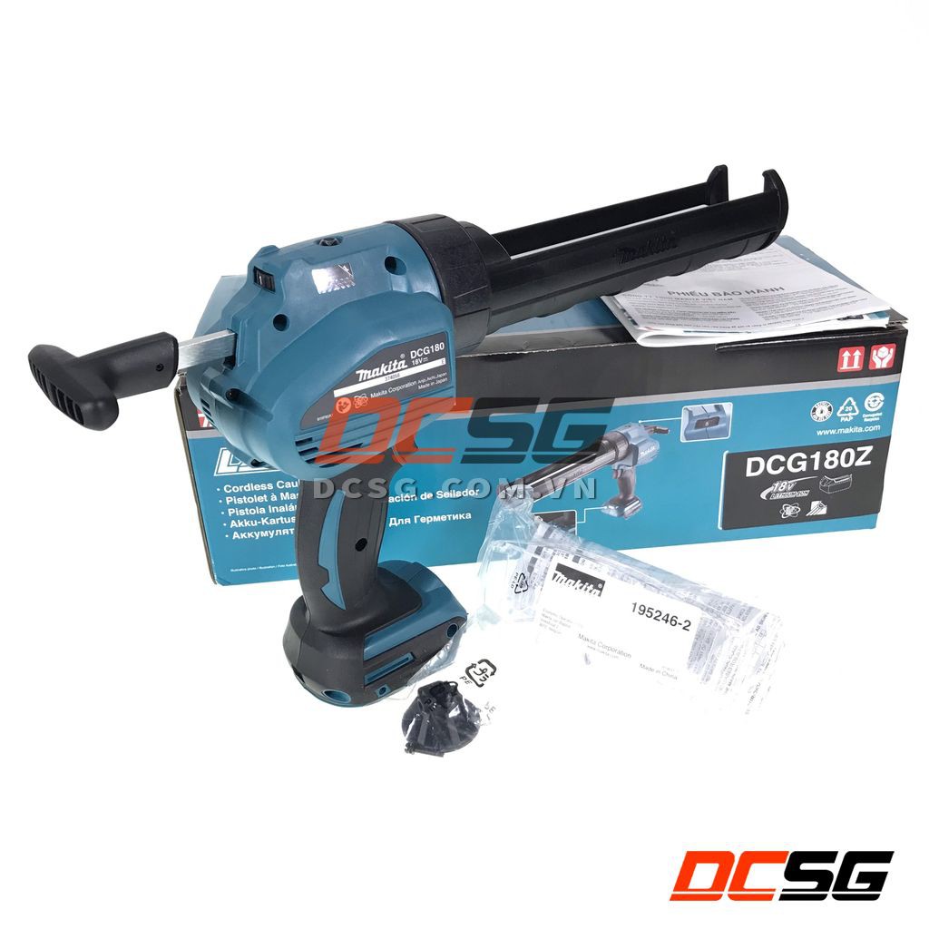 - Máy bắn Silicon dùng pin 18V Makita DCG180Z (thân máy không pin sạc). DCG180Z đặc trưng với sự trang bị khung đỡ kiểu A sử dụng cho tuýp keo Silicon 300ml thông dụng trên thị trường không như phiên bản DCG180ZB trước đó được trang bị khung giá đỡ kiểu B kích thước 600ml chuyên dụng.- Sản phẩm bao gồm: 01 thân máy, 01 khung giá đỡ A sử dụng với tuýp Silicon thông dụng 300ml, 01 thanh chốt truyền ngắn, 01 pít tông, 01 kính bảo hộ.