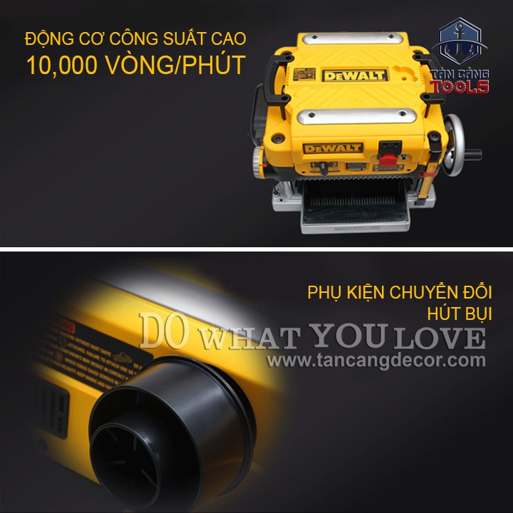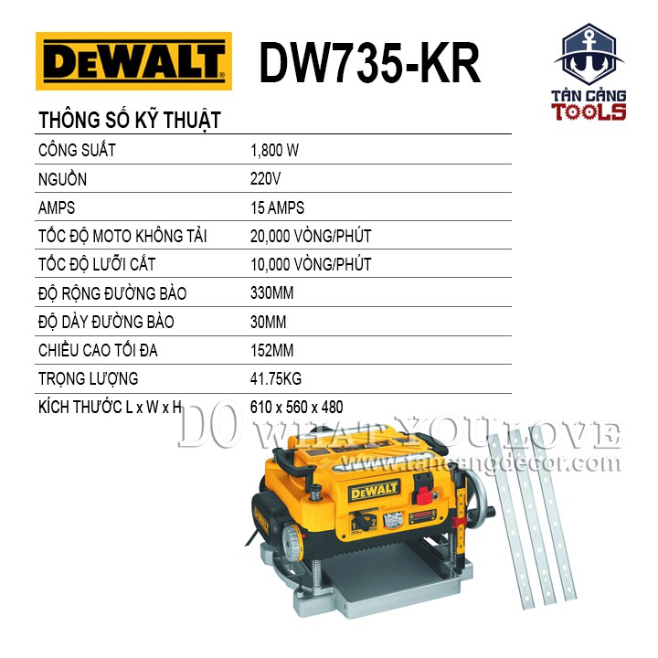 - Máy Bào Cuốn Dewalt DW735 - Tặng Kèm 3 Lưỡi Bào với thiết kế đặc trưng với tông vàng đen của Dewalt, 4 trục vít me sáng bóng có truyền động xích cả 4 trục giúp nâng hạ chuẩn xác.