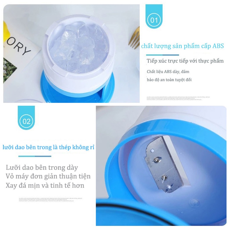 : Máy bào đá bằng tay quay bằng tay được làm từ chất liệu nhựa PP cao cấp nên rất an toàn cho người sử dụng Đồng thời với thiết kế nhỏ gọn bạn có thể đặt mang đi bất cứ nơi đâu. Máy làm đá bào sử dụng cơ năng bằng tay chứ không hề dùng điện nên sử dụng rất an toàn, không lo bị giật hay bị hỏng do chập điện. Máy bào đá có kích thước nhỏ gọn nên bạn có thể đặt máy ở phòng bếp hoặc quầy bar tùy thích. Lưỡi bào thiết kế thép không gỉ càng bào càng bén. Máy bào đá mini quay bằng tay với ưu điểm nhỏ gọn tiện dụng sử dụng lưỡi dao bằng. Chất liệu thép không gỉ, có độ bền cao, giúp bạn tiết kiệm sức lực khi bào đá. Máy hoạt động đơn giản với đầu xay được thiết kế linh hoạt, lại cho đá nhuyễn như TUYẾT nên bạn hoàn toàn có thể yên tâm sử dụng.- Chất Liệu : nhựa an toàn