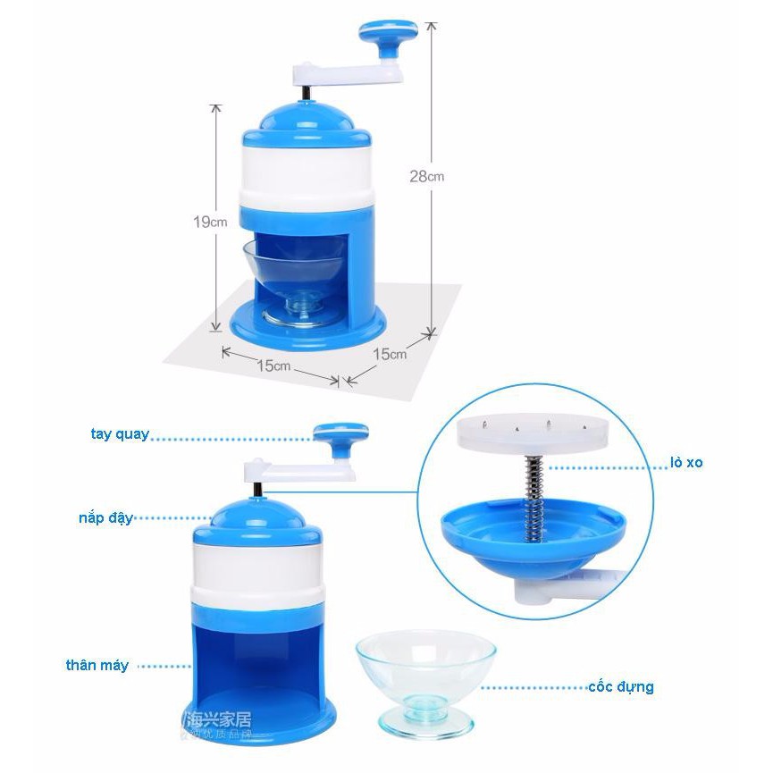 Máy cấu tạo gồm 1 khoang chứa đá cục có kèm lưỡi dao để xay,bên trên là cần xoay và 1 khoang chứa đá phía dưới giúp bạn hứng đá khi xay.