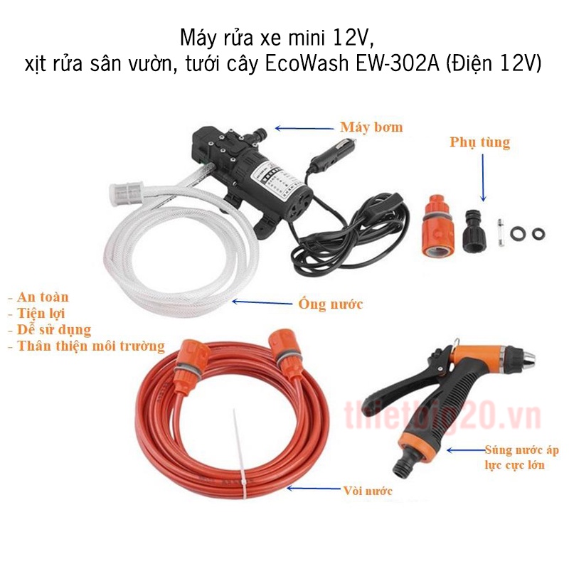 Bộ Máy bơm rửa xe tăng áp lực nước mini. Thiết kế nhỏ gọn, thông minh, tiện dụng. Điện áp 12VDC nên rất an toàn. Có công tắc áp lực, tự động đóng khi đủ áp lực và tự động mở khi giám áp lựcBộ Máy bơm rửa xe tăng áp lực nước mini