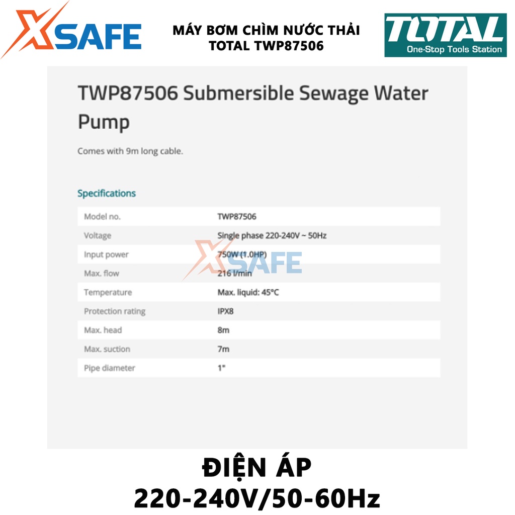 Giới thiệu Máy bơm chìm nước thải TOTAL TWP87506 Bơm chìm mini công suất 750W(1.0HP), motor dây đồng, độ sâu tối đa 7m - [XSAFE]