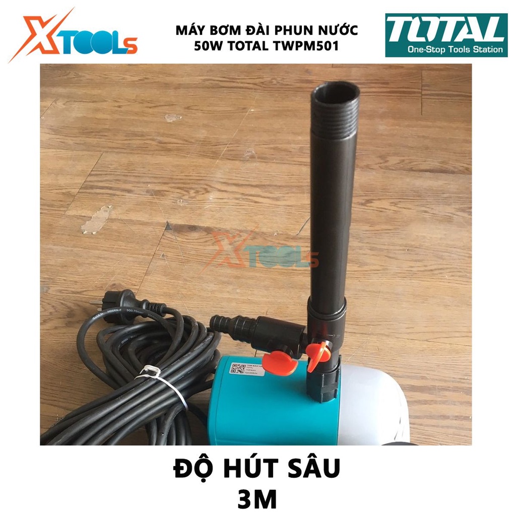 Giới thiệu MÁY BƠM ĐÀI PHUN NƯỚC TOTAL TWPM501 Máy bơm nước hồ cá Công suất 50W Chiều cao bơm 2M Lưu lượng1500L / H Độ hút sâu 3m