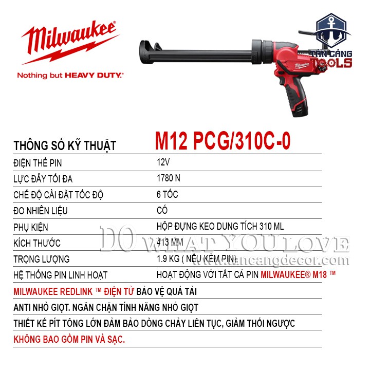 - Máy Bơm Keo Dùng Pin Milwaukee M12 PCG/310C-0 có tác dụng giúp hàn gắn các vết nứt tường do quá trình thi công không đảm bảo, do thời tiết hay nguyên vật liệu, xử lý chống thấm tường, sàn nhà, trần vách, thạch cao mang lại không gian sạch sẽ, khô ráo cho ngôi nhà của bạn.