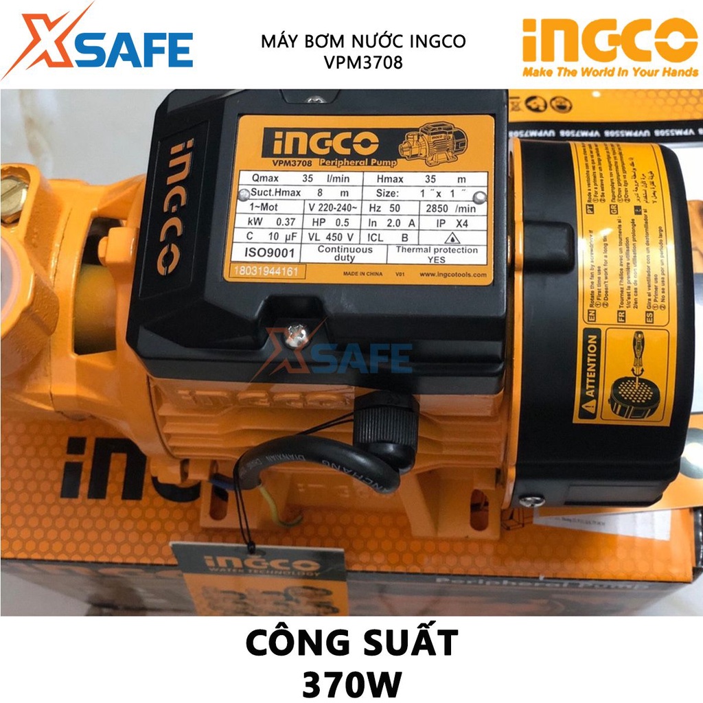 Máy bơm nước INGCO VPM3708 Máy bơm tăng áp 370W(0.5HP), chiều cao bơm tối đa 35m, độ hút sâu 8m, mô tơ dây đồng - XSAFE