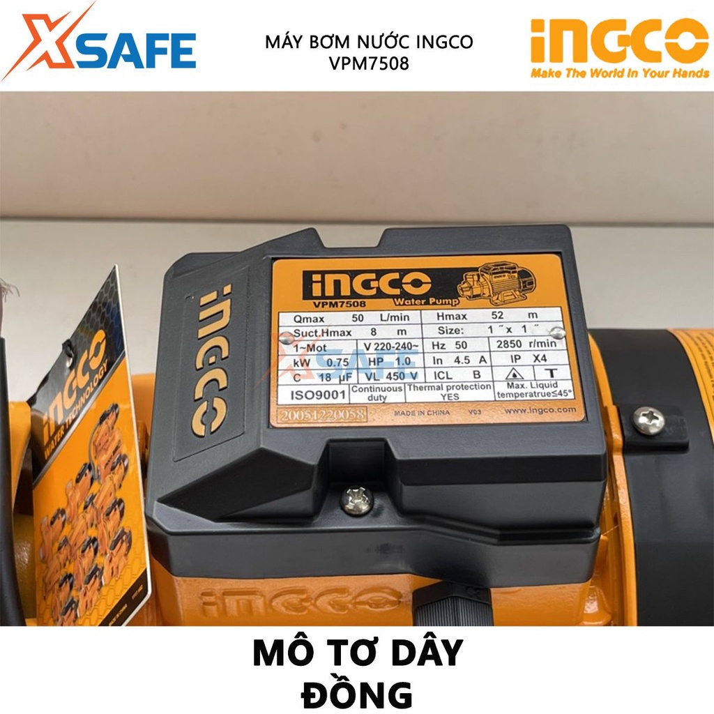 Máy bơm nước INGCO VPM7508 Máy bơm tăng áp 750W(1HP), chiều cao bơm tối đa 52m, độ hút sâu 8m, mô tơ dây đồng - [XSAFE]