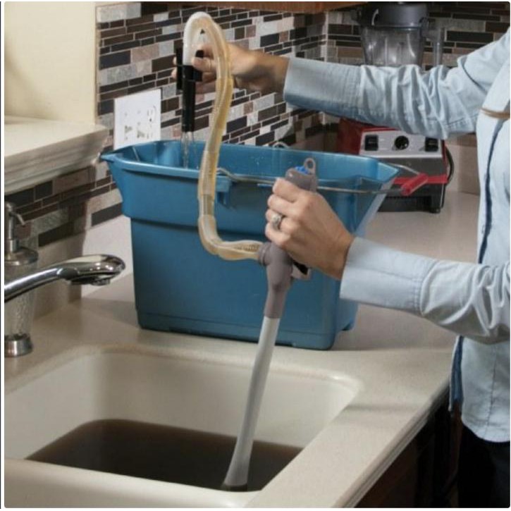 Khi hoàn tất, giữ cho bơm thẳng đứng và nâng tay cầm phía trên cơ chế bơm để thoát bất kỳ chất lỏng nào trở lại thùng chứa ban đầu. Không đặt bơm xuống cho đến khi tất cả chất lỏng đã được rút ra khỏi ống và bơm.