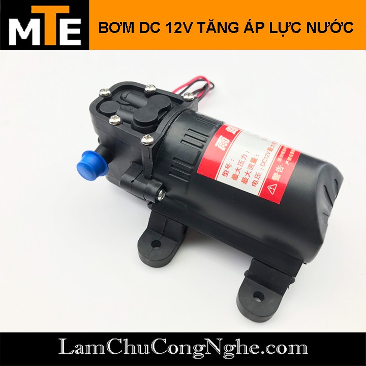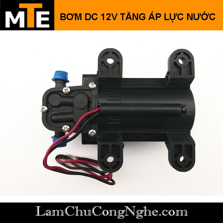 Máy bơm tăng áp lực nước mini dùng điện 12V từ acquy, adapter. Bơm được sử dụng rộng rãi trong bơm nước phun sương làm mát, làm vườn, rửa xe,…Sản phẩm gồm: 1 bơm tăng áp 12v