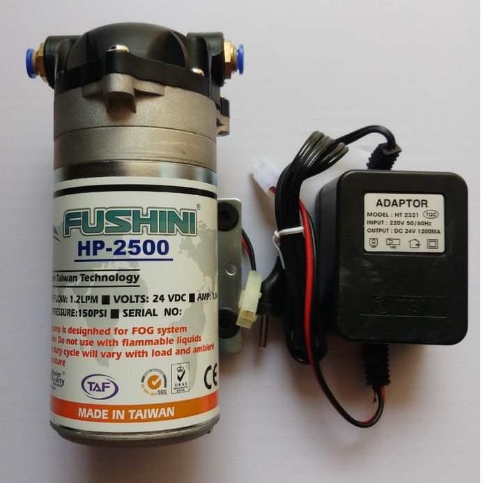 Máy bơm nước mini FUSHINI HP 2500 24V có thể dùng bơm phun sương áp lực kèm nguồn Adaptor 24V