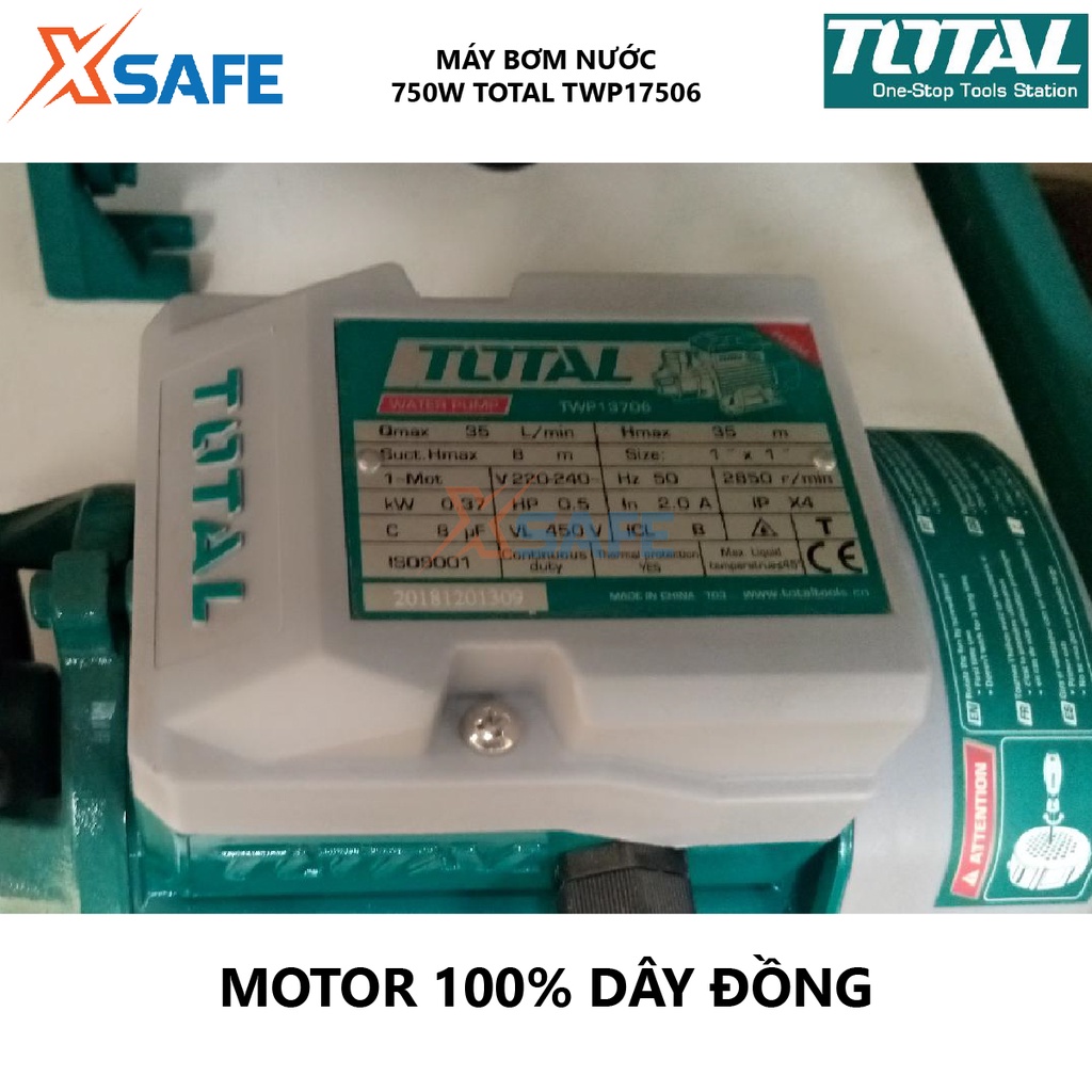 Máy bơm nước TOTAL TWP17506 công suất 750W(1HP), mô tơ dây đồng, chiều dài dây cáp 0.15m - Chính hãng [XSAFE]