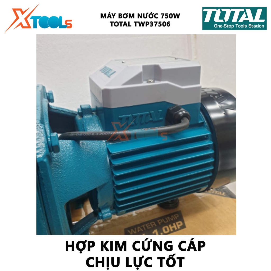- Máy bơm nước Total TWP37506 sử dụng hợp kim cứng cáp, chịu lực tốt. Đặc biệt, động cơ bằng 100% dây đồng nguyên chất giúp máy hoạt động êm và ít tốt điện. Cánh quạt được chế tạo bằng đồng bền bỉ.