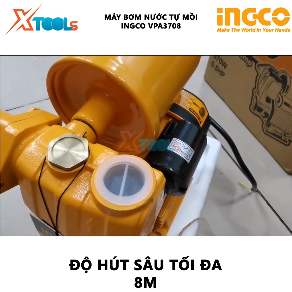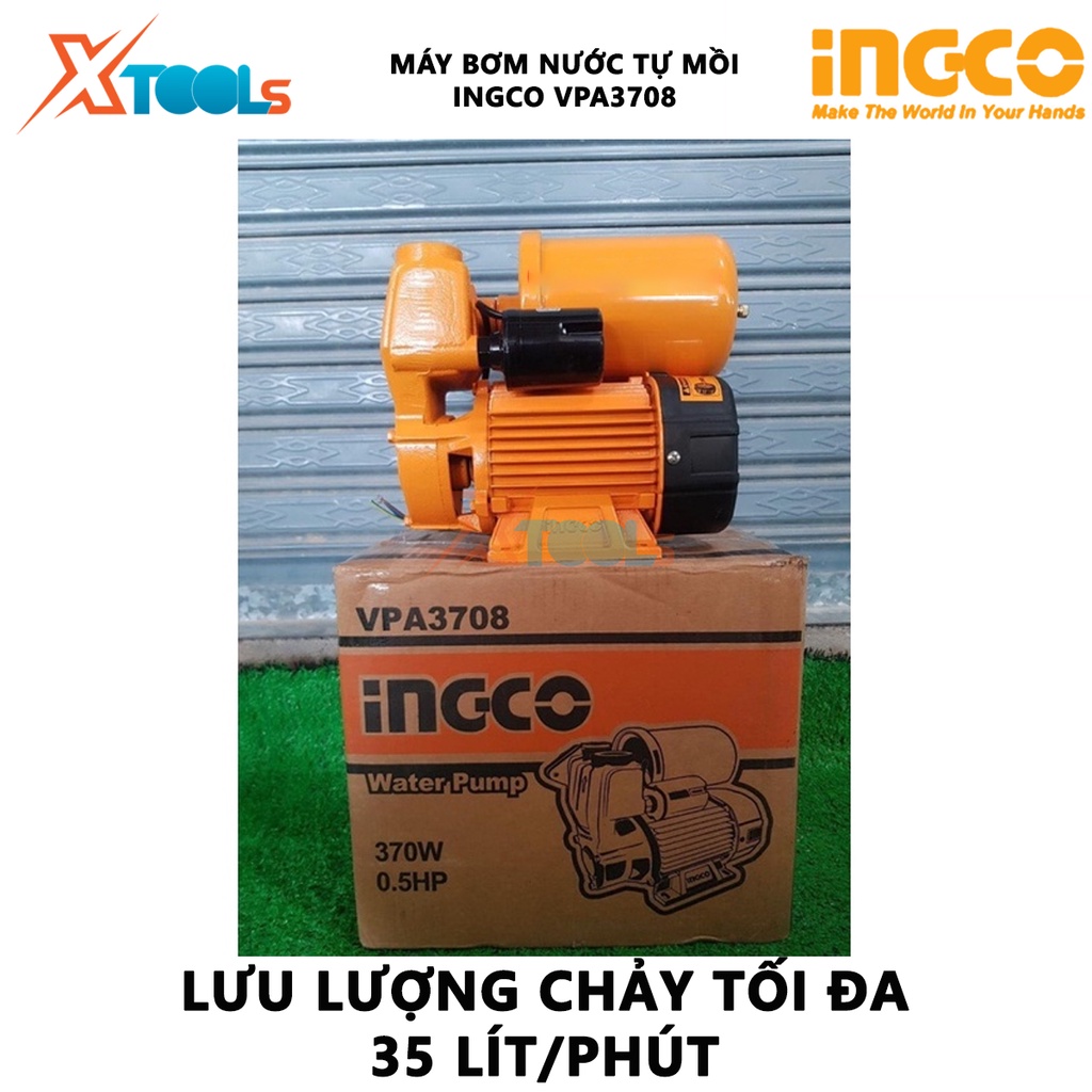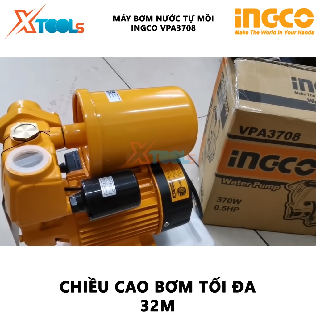 Máy bơm nước tự mồi INGCO VPA3708 Máy bơm nước Điện áp: 220-240V ~ 50Hz Công suất đầu vào 370W (0,5HP) Chiều cao bơm tối