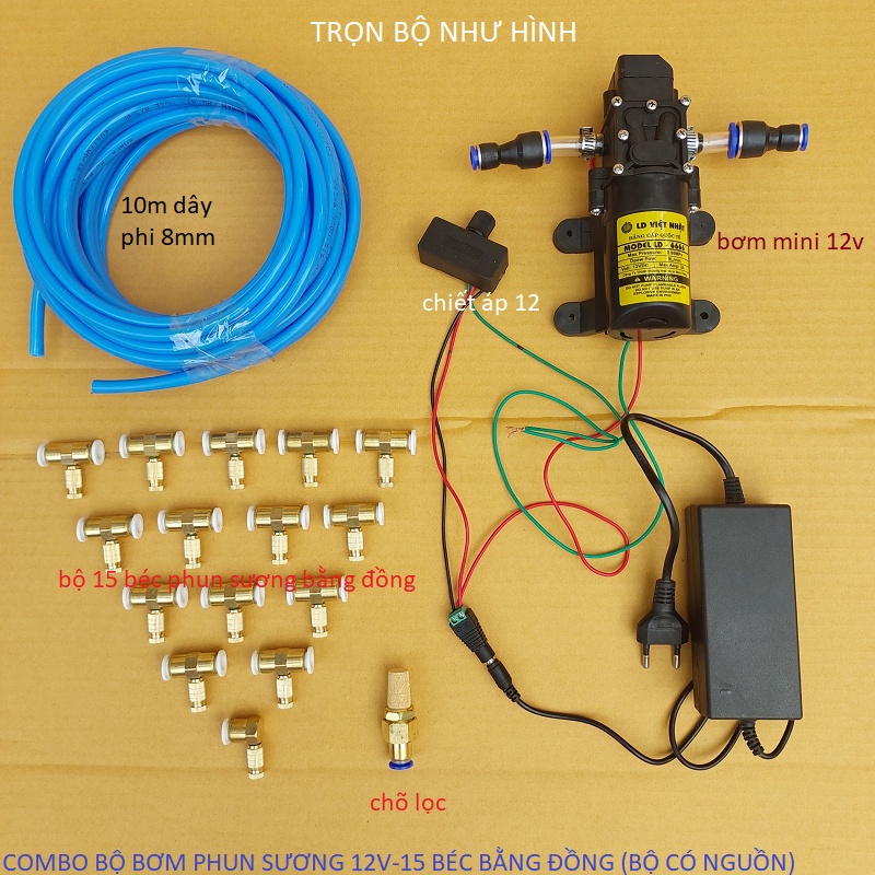 Bộ máy bơm phun sương 5 béc đến 30 béc, có chiết áp điều chỉnh lượng nước (bộ có nguồn)