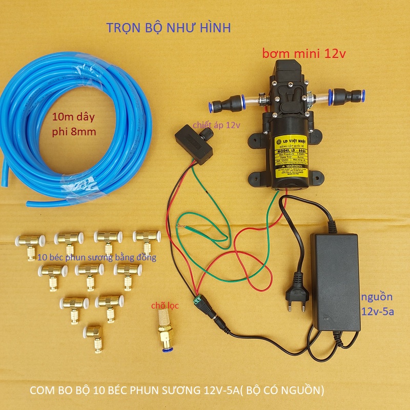 Giới thiệu Bộ máy bơm phun sương 5 béc đến 30 béc, có chiết áp điều chỉnh lượng nước (bộ có nguồn)