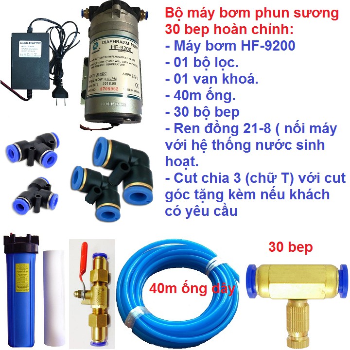 Bộ máy bơm phun sương hoàn chỉnh 30 bep dùng máy bơm HEADON HF9200:Bộ sản phẩm gồm có: