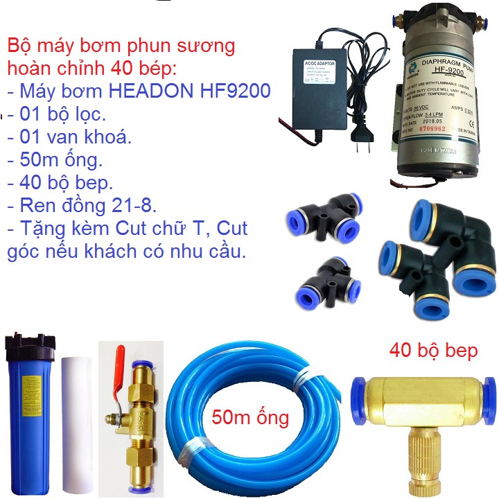 Bộ máy bơm phun sương hoàn chỉnh 40 bep dùng máy bơm HEADON HF9200:Bộ sản phẩm gồm có: