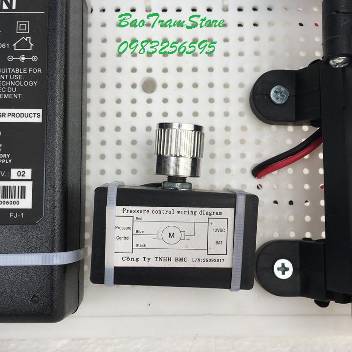 Giới thiệu Bộ máy bơm tăng áp mini tự ngắt 12v Việt Thái ZQ2203 kèm bộ nguồn 12v, chiết áp 12v BMC đã được ráp sẵn vào bảng điện.