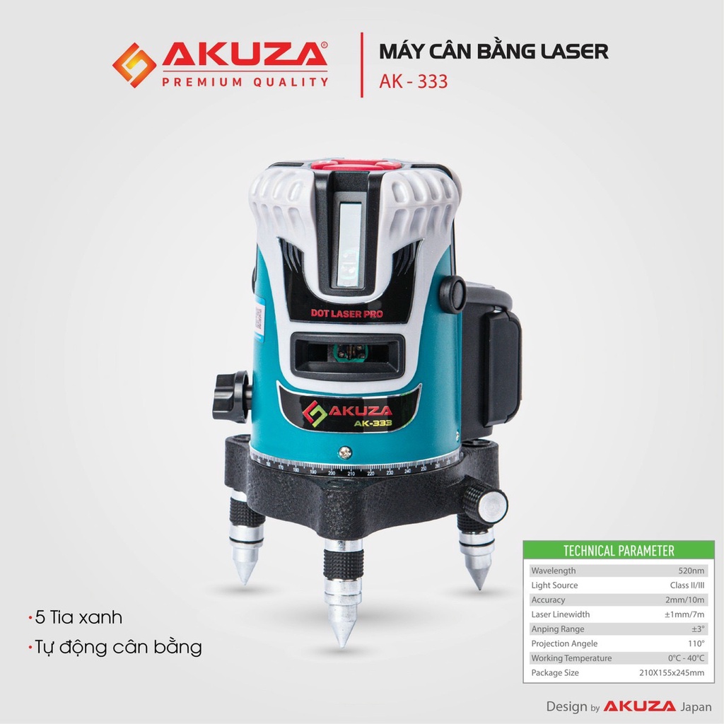 Máy cân bằng Laser 5 tia xanh AKUZA AK-333Máy cân bằng Laser 5 tia xanh Akuza AK-333 đã trở nên phổ biến với tất cả các lĩnh vực cần độ chính xác và nhanh chóng trong đo đạc. Với khả năng đo lường chính xác - dễ dàng sử dụng - độ bền bỉ cao - đa ứng dụng - giá thành hợp lý. Sản phẩm là lựa chọn lý tưởng cho mọi công trình Việt.