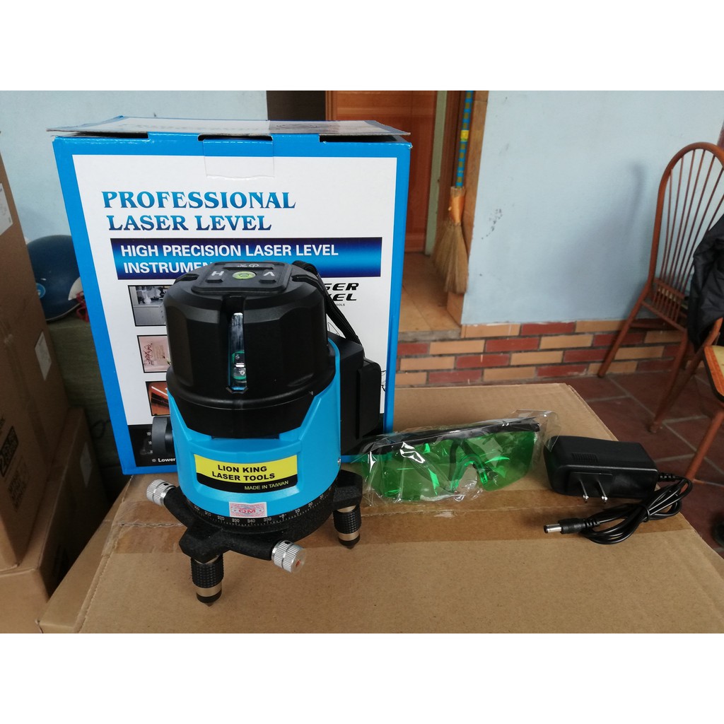 + Đầu ra tia laser màu xanh 4 tia ngang, 1 tia dọc vuông góc nhau, 1 chấm laser dọi xuống