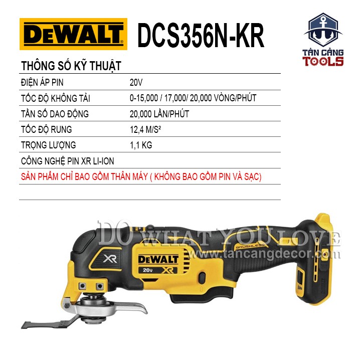 - Máy Cắt Rung Đa Năng Dùng Pin Có Điều Tốc DeWalt 18V DCS356N ( Thân Máy ) được thiết kế để cưa và cắt các nguyên vật liệu bằng gỗ, nhựa, thạch cao, kim loại màu p như : đinh, ghim dập chưa hết. Máy cũng thích hợp để làm việc với gạch ốp lát tường mềm, cũng như sử dụng để chà khô và cạo bề mặt nhỏ. Máy đặc biệt thích hợp để gia công các vị trí cạnh biên và cắt bằng mặt.