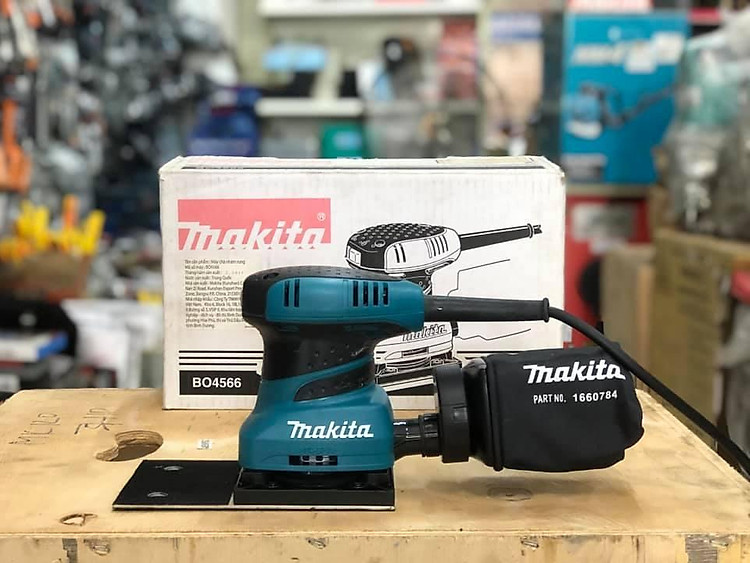 Trong hộp có: Máy chà nhám rung Makita BO4566, Hộp chứa bụi / Túi đựng bụi.