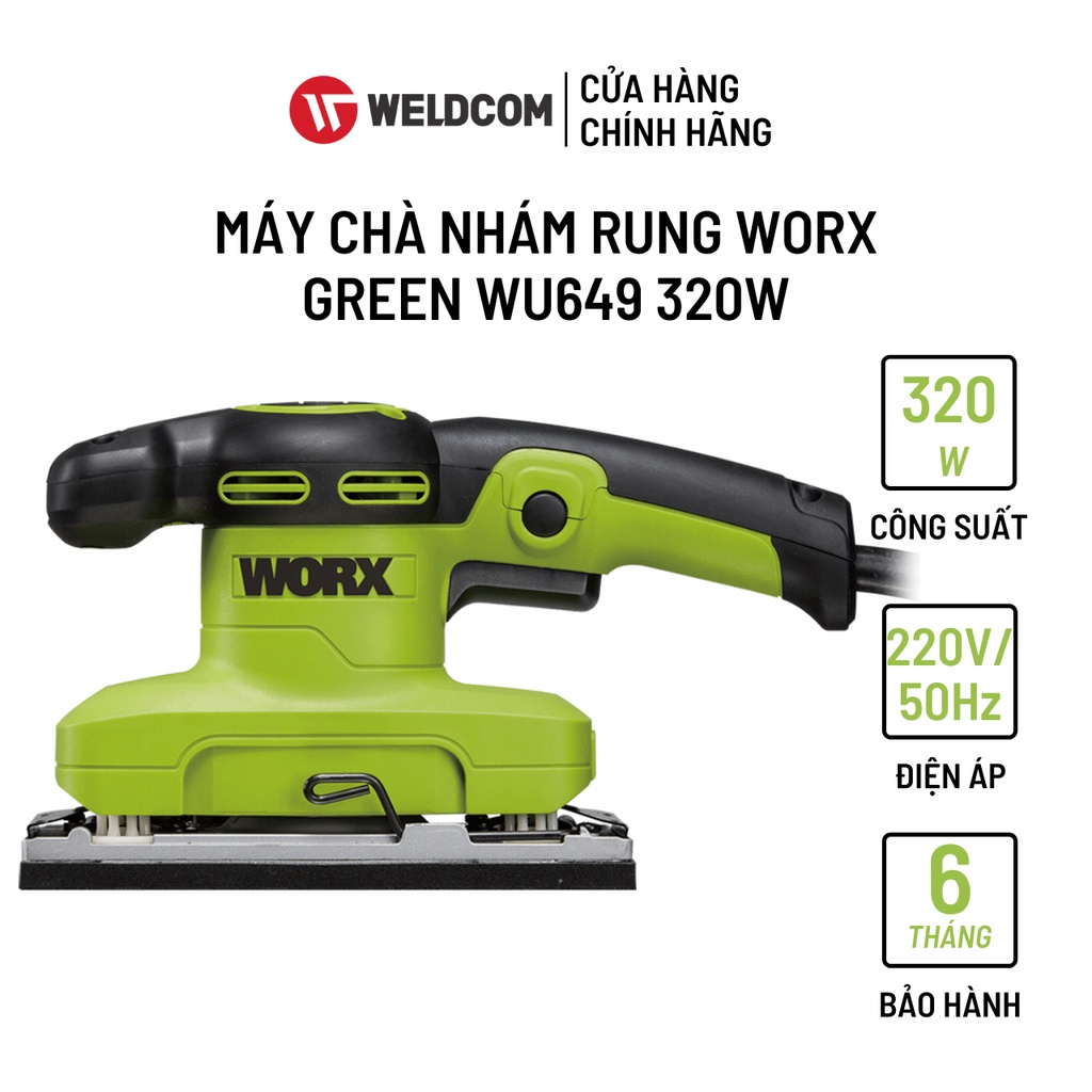 Máy Chà Nhám Rung WORX GREEN WU649 Chống Rỉ Sét Có Tay Cầm Cao Su Thoải Mái 320WTHÔNG TIN SẢN PHẨM (Máy Chà Nhám Rung WORX GREEN WU649)