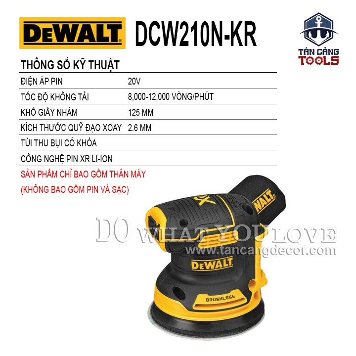 - Máy Chà Nhám Tròn Dùng Pin DeWalt 20V DCW210N-KR là sản phẩm rất lý tưởng cho nhiều ứng dụng chà nhám khác nhau, kể cả loại bỏ vết bẩn,lớp sơn cũ và tạo bệ mặt hoàn thiện siêu mịn. Động cơ không chổi than được chế tạo chính xác cung cấp hiệu suất cao nhất ,hoàn toàn có thể đáp ứng các yêu cầu khắt khe nhất