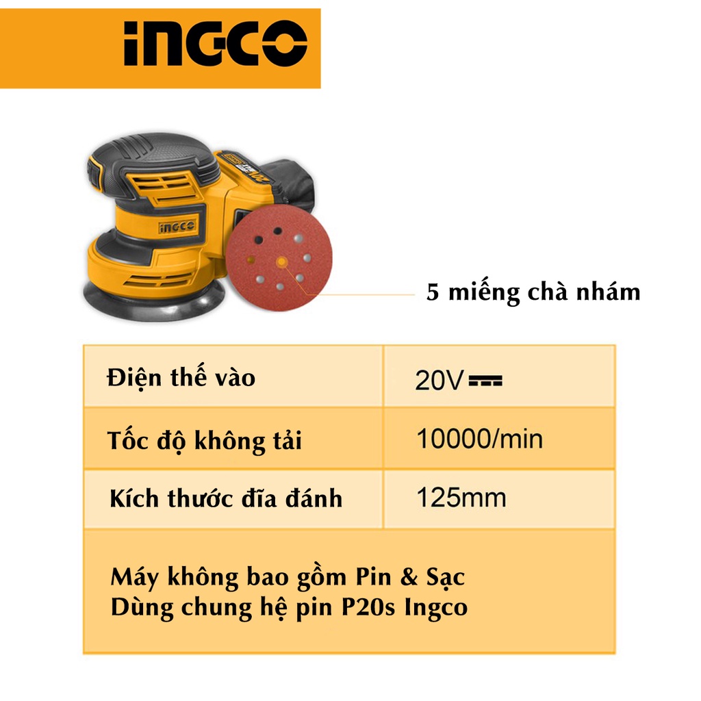 Máy chà nhám tròn dùng pin INGCO CROSLI20011. Thông số kỹ thuật: