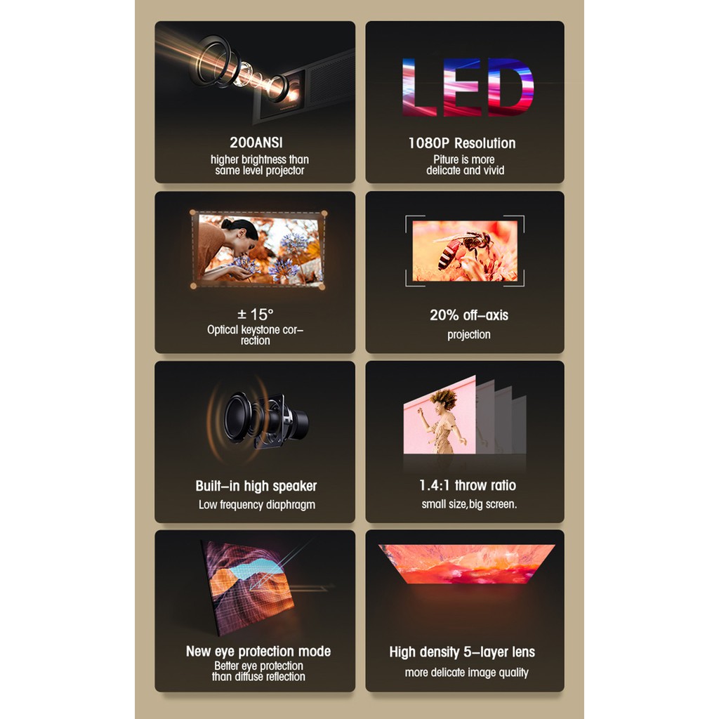 - Độ phân giải thật 1920 * 1080P với độ sáng 3600 lumens (200 ANSI Lumens) cho hình ảnh sáng rõ đẹp.