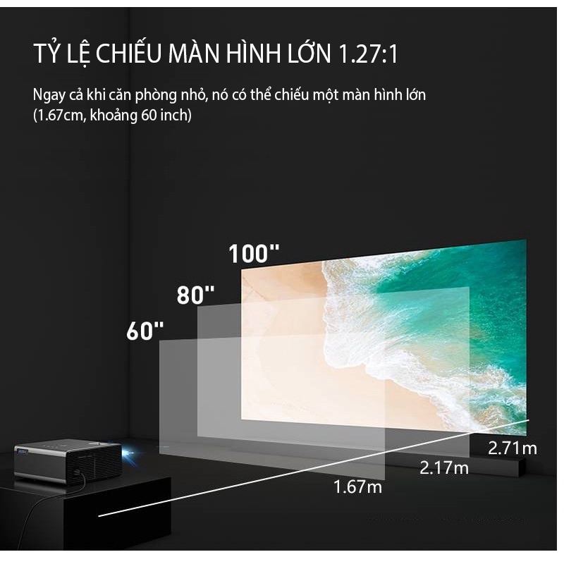 - Máy chiếu siêu nhỏ gọn, siêu tiện lợi, có thể chiếu thẳng lên tường kích thước từ 30 inch lên tới 160 inch, xem phim - giải trí tại nhà, mang đi du lịch hay đi họp để trình chiếu nội dung