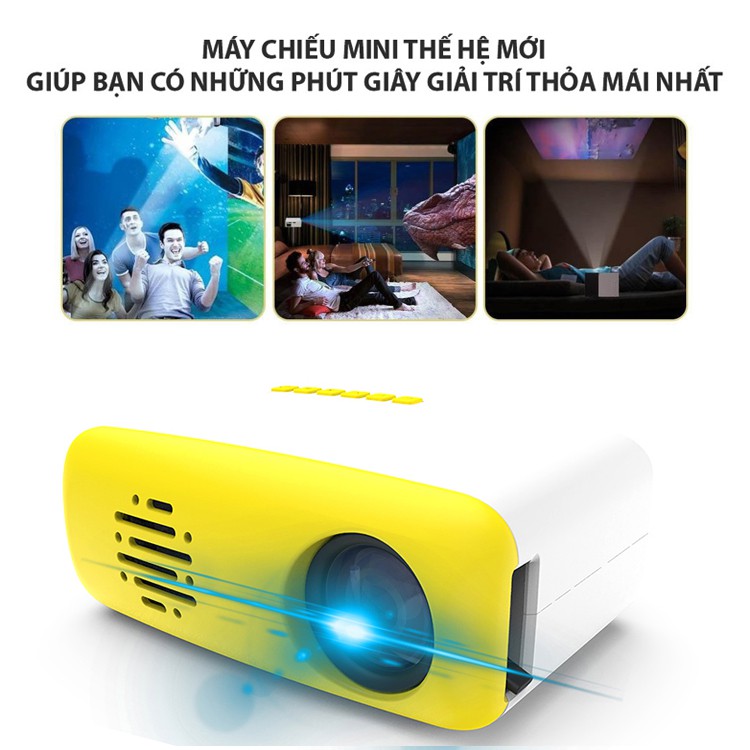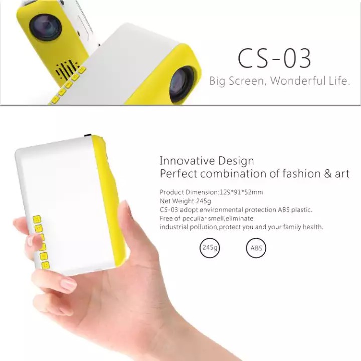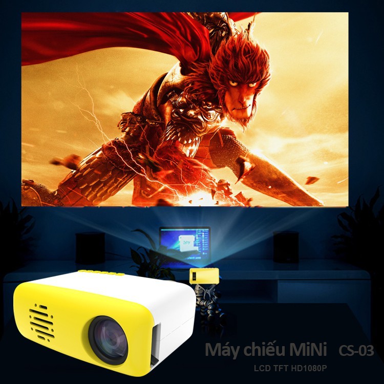 Máy Chiếu Mini CS-03 Smart LED Projector Cao Cấp Phiên Bản Mới 2019Thiết bị máy chiếu nhỏ gọn cầm tay CS-03 Smart LED Projector có độ phân giải 320 x 240, độ sáng 48 Lux hỗ trợ khả năng trình chiếu hình ảnh rõ, sáng trong nhiều môi trường. Khoảng cách chiếu cho máy lên tới 2 mét. Ưu điểm nổi bật của chiếc máy chiếu mini CS-03 Smart LED Projector: Máy chiếu mini CS-03 chỉ nhỏ bằng một chiếc iPhone x, tích hợp pin sạc nên dễ dàng đút túi để mang theo người như những thiết bị di động khác. CS-03 Smart LED Projector sử dụng công nghệ màu DLP cường độ sáng cho hình ảnh sắc net và chân thực, kết hợp cùng bóng LED cho tuổi thọ cao lên tới 30.000 giờ. Là một chiếc máy chiếu nhỏ gọn, đa chức năng. Máy chiếu mini LED Projector hỗ trợ xuất hình ảnh ra đến tối đa 40-60inch Hỗ trợ các cổng giao tiếp thông dụng như HDMI, USB (cắm smartphone hay USB Data xem phim nghe nhạc), Jack audio 3.5mm, khe cắm thẻ nhớ microSD,... Xem phim độ nét cao HD với USB hoặc ổ cứng ngoài. Ngoài ra còn có cổng microUSB giúp bạn lấy nguồn điện thì trực tiếp từ pin sạc dự trữ,... Với tuổi thọ đèn Led lên đến hơn 30.000 giờ, sản phẩm có kèm theo remote hồng ngoại điều khiển từ xa vô cùng tiện lợi.