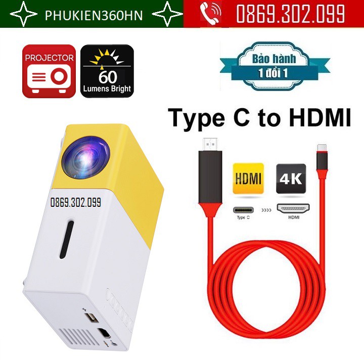 Máy chiếu Mini cho điện thoại YG-300 + Cáp HDMI 2K 4K Kết Nối Tivi Với Điện Thoai Qua Chân Type C