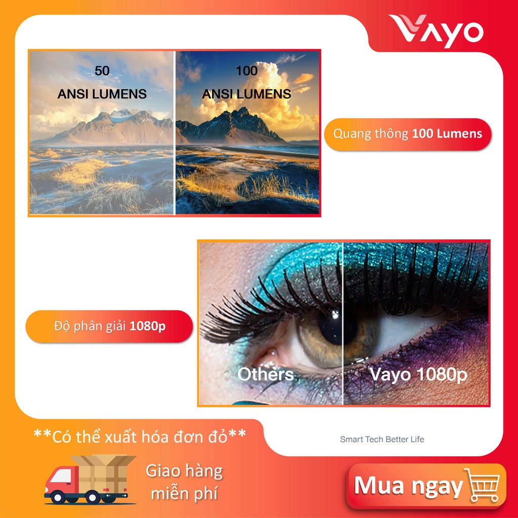 📹 Máy chiếu thông minh mini Vayo - Smart Mini ProjectorMáy chiếu thông minh mini Vayo với kích thước nhỏ gọn thuận tiện cho bạn mang theo mọi lúc mọi nơi, tăng tiện ích cho phong cách sống hiện đại có thể sử dụng máy chiếu để xem bộ phim yêu thích hay xem trực tiếp trận bóng đá, vui chơi giải trí hát karaoke với bạn bè, hoặc sử dụng hỗ trợ cho việc thuyết trình trong công việc cũng như việc dạy và học