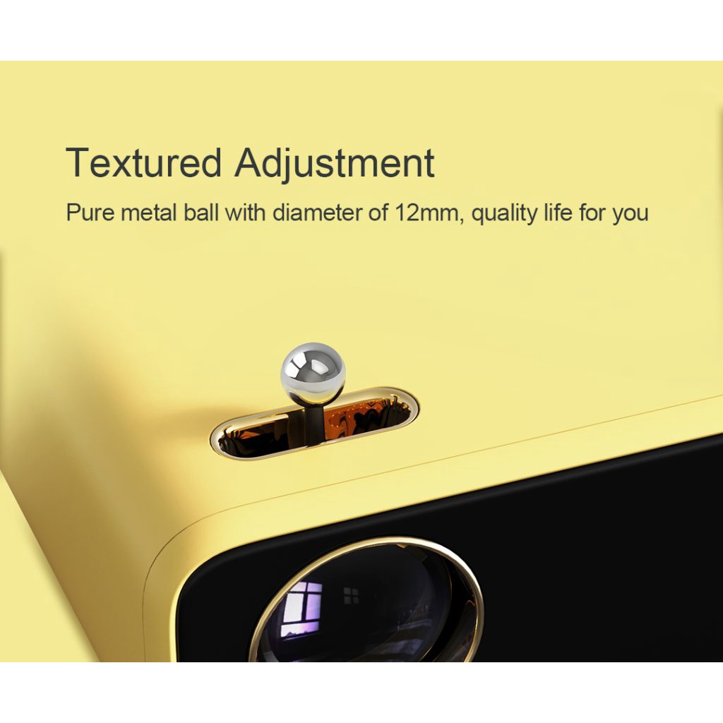 Về thiết kế của Wanbo XS01 Mini tuy nhỏ nhưng lại có võ. Với màu vàng chủ đạo đi kèm với đen mang hơi hướng cổ xưa tạo cảm giác sang trọng hơn, Cần điều chỉnh bằng inox cũng là điểm nhấn với vẻ ngoài cùa máy chiếu.