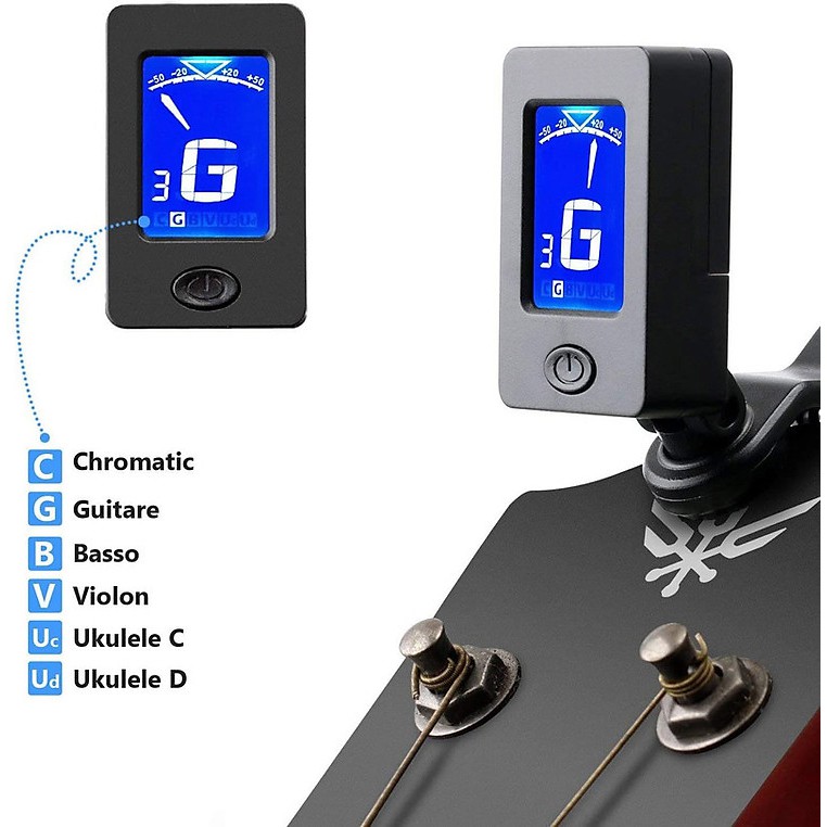 Tuner guitar có 5 chế độ lên dây lần lượt ký hiệu là C, G, B, V và U tương đương với Chromantic, Guitar, Bass, Vionlin và Ukulele.Chế độ Chromantic có thể lên dây cho hầu hết các loại nhạc cụ, chế độ Guitar hiển thị đầy đủ chỉ số 6 của dây đàn guitar lần lượt từ thấp lên cao là Mì, Là, Rê, Sol, Si, Mí tương ứng với thứ tự giảm dần từ 6. 5. 4. 3. 2. 1. Tương tự với các chế độ các dùng cho Guitar Bass, Violin và đàn ukulele.