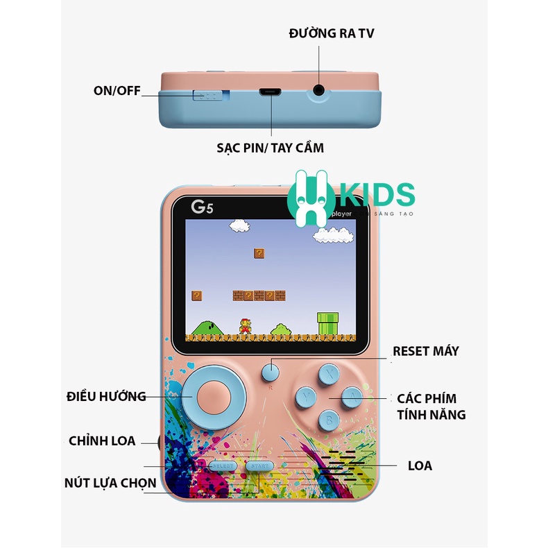 Máy chơi game 4 nút cầm tay, màn hình LCD, sẵn 500 game, pin dung lượng 6-8 tiếng kèm tay cầm 2 người chơi là mẫu đồ chơi giải trí giảm stress cho cả gia đình cực hay của X-KIDS. Chiếc gamepad cầm tay G5 sẽ giúp các bạn 8x-9x quay về kí ức tuổi thơ với những trò game 4 nút nổi tiếng 1 thời như Contra - Natra Cứu Mẹ - Super Mario - Xếp Thuốc - Xe tăng - Đặt bom - Boxing... nhiều ơi là nhiều, sẵn 500 trò chơi lận á các bạn có thể tha hồ chọn lựa. Không những các bạn già mà đây còn là món quà cho trẻ em sau những giờ học căng thẳng sắp tới.💥 Lưu Ý sản phẩm máy điện tử cầm tay 4 nút G5 cao cấp của X-KIDS so với máy cầm tay giá rẻ thị trường
