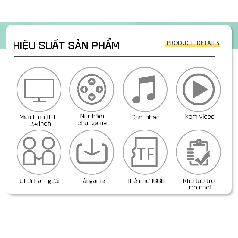 Các tính năng:Màn hình 2.4 inch : Màn hình hiển thị độ nét cao 2.4 inch, thiết kế siêu mỏng và nhỏ gọn, đủ nhỏ để bạn mang theo. Được thiết kế riêng cho trẻ em, phù hợp cho bạn hoặc bé yêu của bạn để giết thời gian khi đi du lịch hoặc ở nhà.