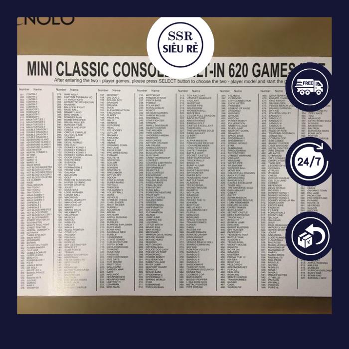 Sản phẩm được cài sẵn trong bộ nhớ trong của máy gần 620 tựa game 8 bit, trong số đó có rất nhiều tựa game gắn liền với thời tuổi thơ của chúng ta như: Contra, Mario, Ninja cứu mẹ, Tank, Bác sỹ Mario, Ninja Kage, Tiny toon, Chip & Dale, Đá bóng chưởng, Ninja Mèo…