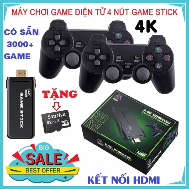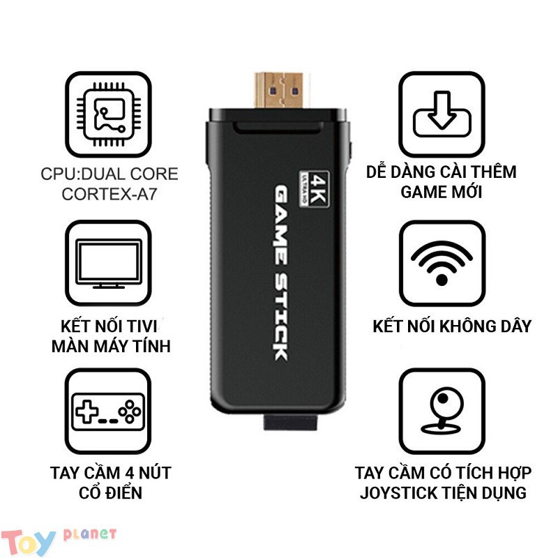 1. game stick nhỏ gọn nhưng có sẵn 3000+ game kinh điển của tuổi thơ (shop chỉ còn loại 32gb,3000+ game), tổng hợp từ các dòng máy rất nổi tiếng với thế hệ 7x,8x như: Mame (điện tử thùng), PS1, GB..v..v…Bạn sẽ dễ dàng tìm thấy tất cả các tựa game đã từng khiến tất cả thanh thiếu niên Việt Nam nhưng năm 2000 phải mê mẩn, trốn học, trốn cha, trốn mẹ để để đi quẩy như: Contra, Battle City (bắn tank), Super Mario, Mortal Kombat, Metal Slug (rambo lùn)…2. Kết nối với Tivi hoặc Màn hình máy tính qua cổng HDMI (nếu tivi của bạn là đời cũ, cần mua dây chuyển từ HDMI sang VGA). Tay cầm dạng 4 nút truyền thống có đầy đủ các phím chắc năng và 2 cần Joystick hoạt động chuẩn chỉ. Và đặc biệt là kết nối Wireless không dây, vừa gọn gàng lại thoải mái thao tác. Khoảng cách khả dụng lên tới 20m (hoạt động tốt nhất trong khoảng 7-10m)