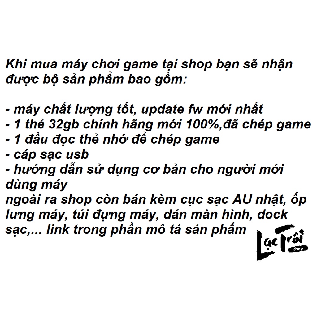 - Phụ kiện máy bao gồm cáp sạc, thẻ nhớ, hướng dẫn cài đặt game.