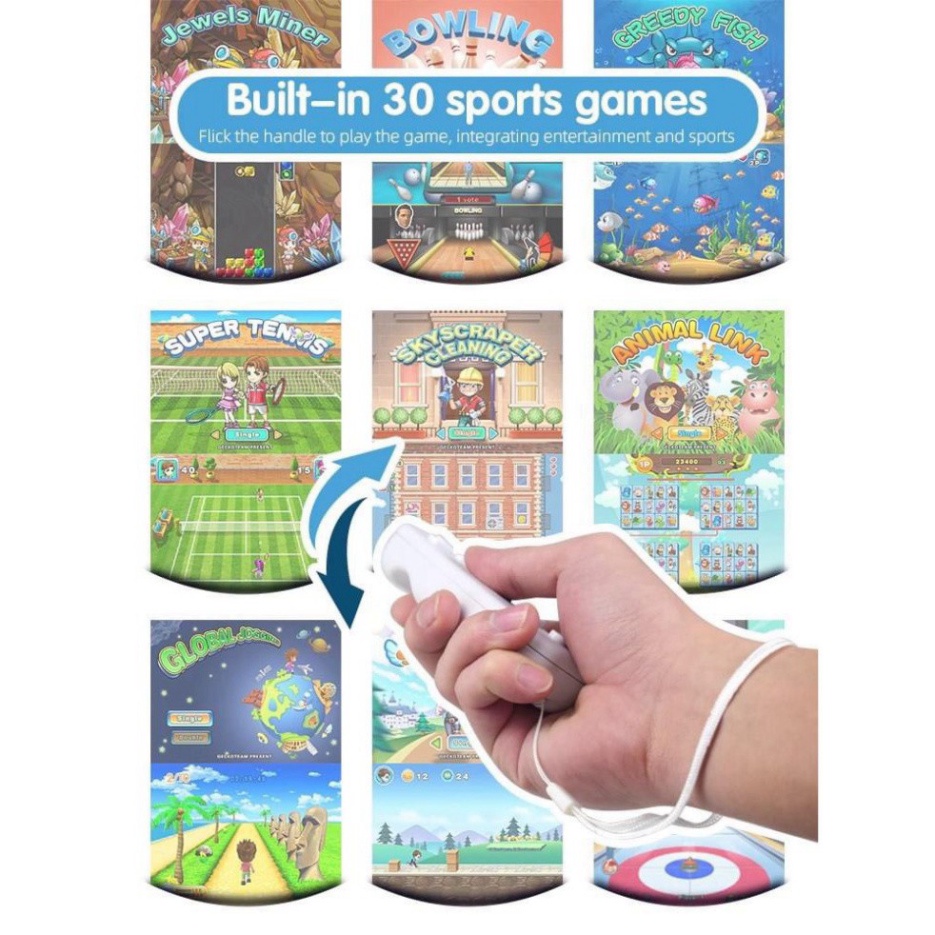 1. Tích hợp 30 trò chơi cảm âm tương tác, 800 trò chơi định dạng NES, sử dụng hai tay cầm điều khiển từ xa không dây, có dây chống rơi, người chơi có thể chơi nhiều trò chơi cảm âm khác nhau, chẳng hạn như cắt dưa hấu, chạy, đánh cầu lông, v.v., miễn là tay cầm được xoay.