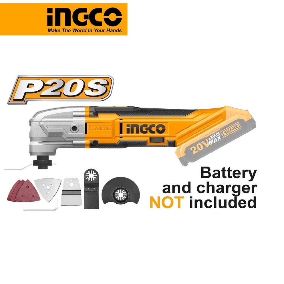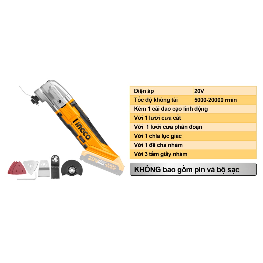 Nhà cửa & Đời sống > Dụng cụ & Thiết bị tiện ích > Dụng cụ > Cưa, máy cắt & máy mài || Máy công cụ đa năng dùng pin Lithium-ion 20V hiệu INGCO CMLI2001 có thể thay đổi tốc độ , đi kèm với 8 chiếc phụ kiện dCòn hàng