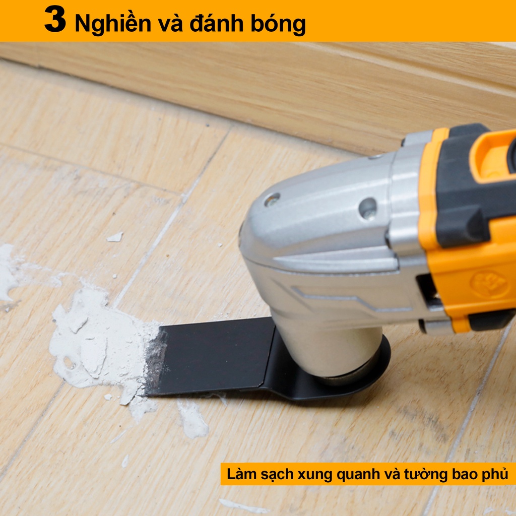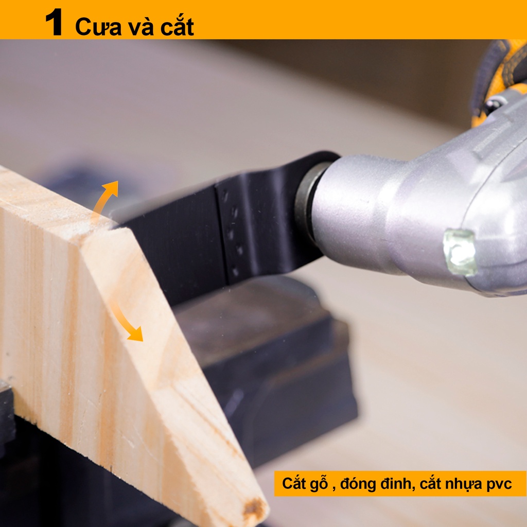 Giới thiệu Máy công cụ đa năng dùng pin Lithium-ion 20V hiệu INGCO CMLI2001 có thể thay đổi tốc độ , đi kèm với 8 chiếc phụ kiện d